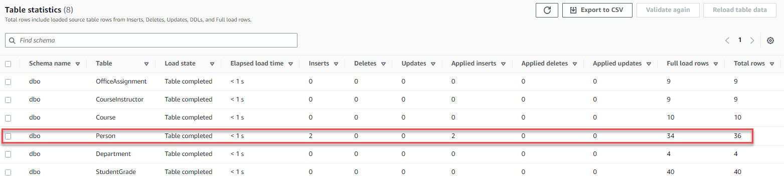 - Monitor the AWS DMS task and check for the table Person.