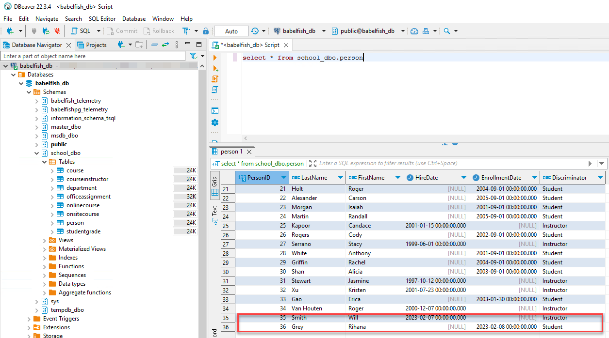 - Connect to the target Babelfish cluster and query the Person table to validate the inserted rows.
