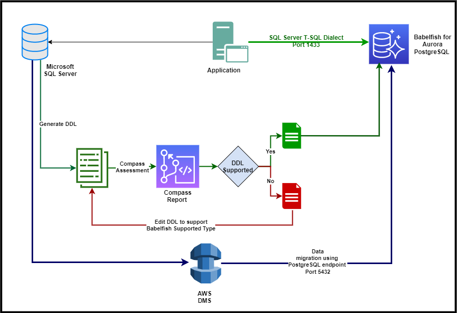 Additionally, we assume that DDLs have been extracted, analyzed, and modified with the Compass tool. For instructions, refer to Migrate from SQL Server to Amazon Aurora using Babelfish.