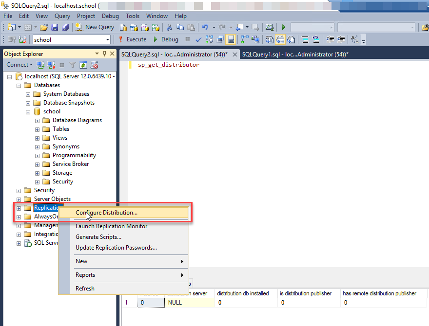 - On SSMS, choose (right-click) Replication and choose Configure distribution.