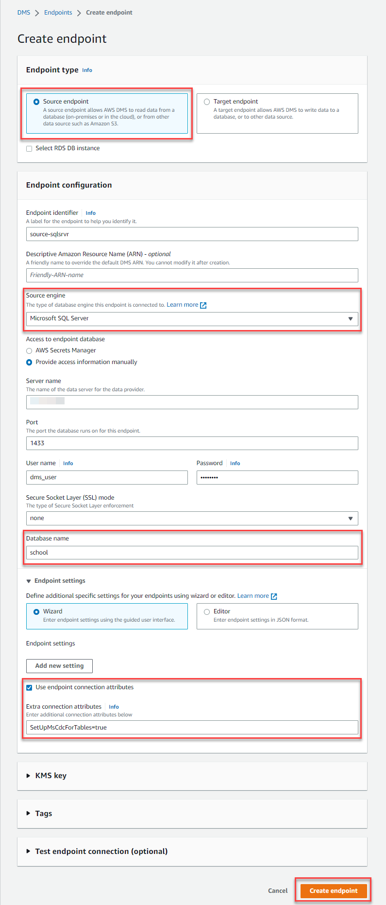 SetUpMsCdcForTables=trueto set up CDC for your database automatically. - Choose Create endpoint.