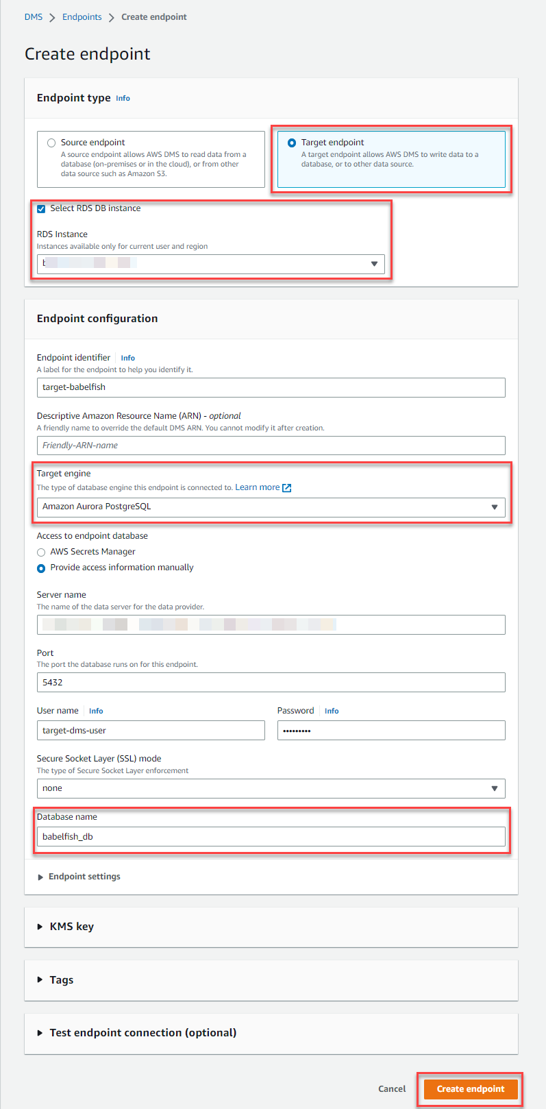 babelfish_db. - Choose Create endpoint.