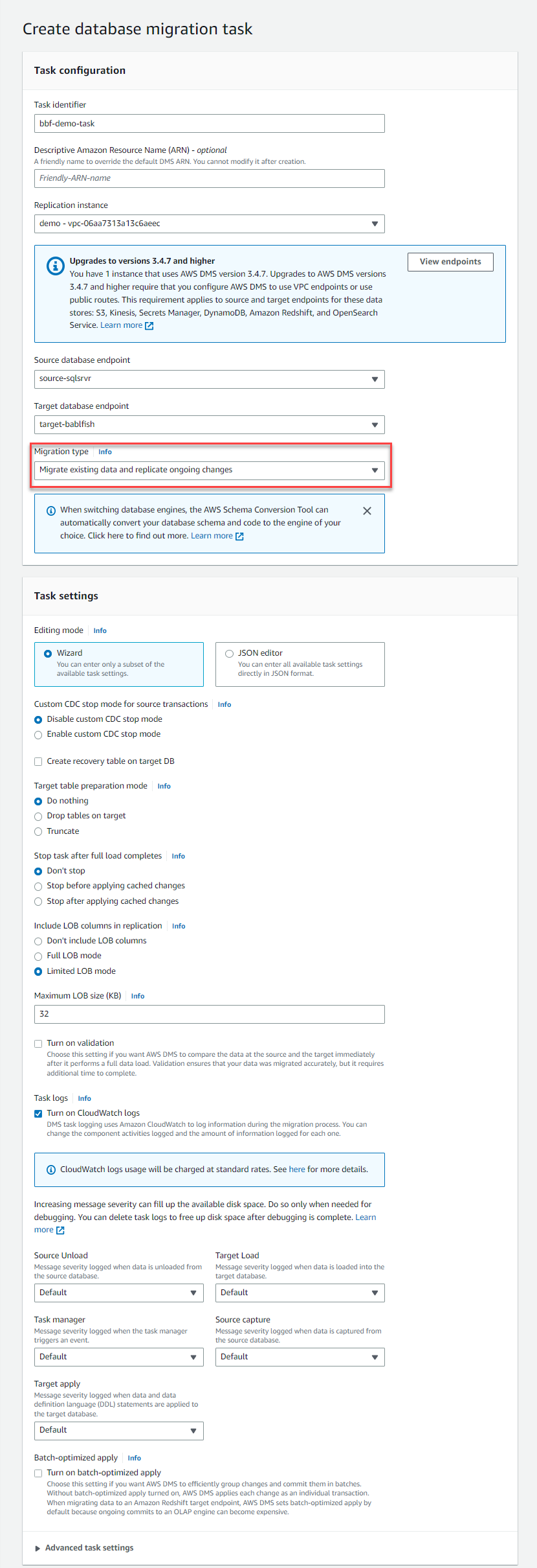 Now we can create an AWS DMS migration task.