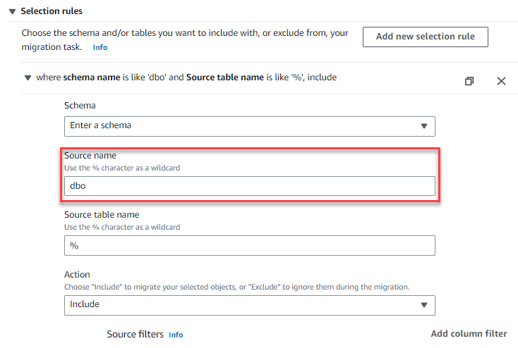 - In the Table mapping section, expand Selection rules.