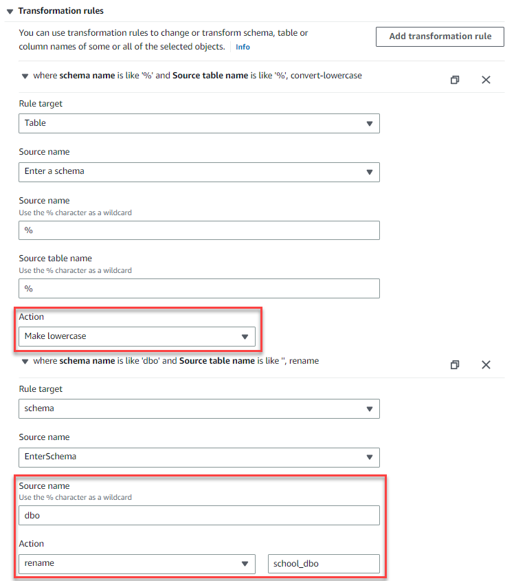 - Add two transformation rules to align with the schema mapping in Babelfish (If you are using single-database migration mode you can skip step b) :