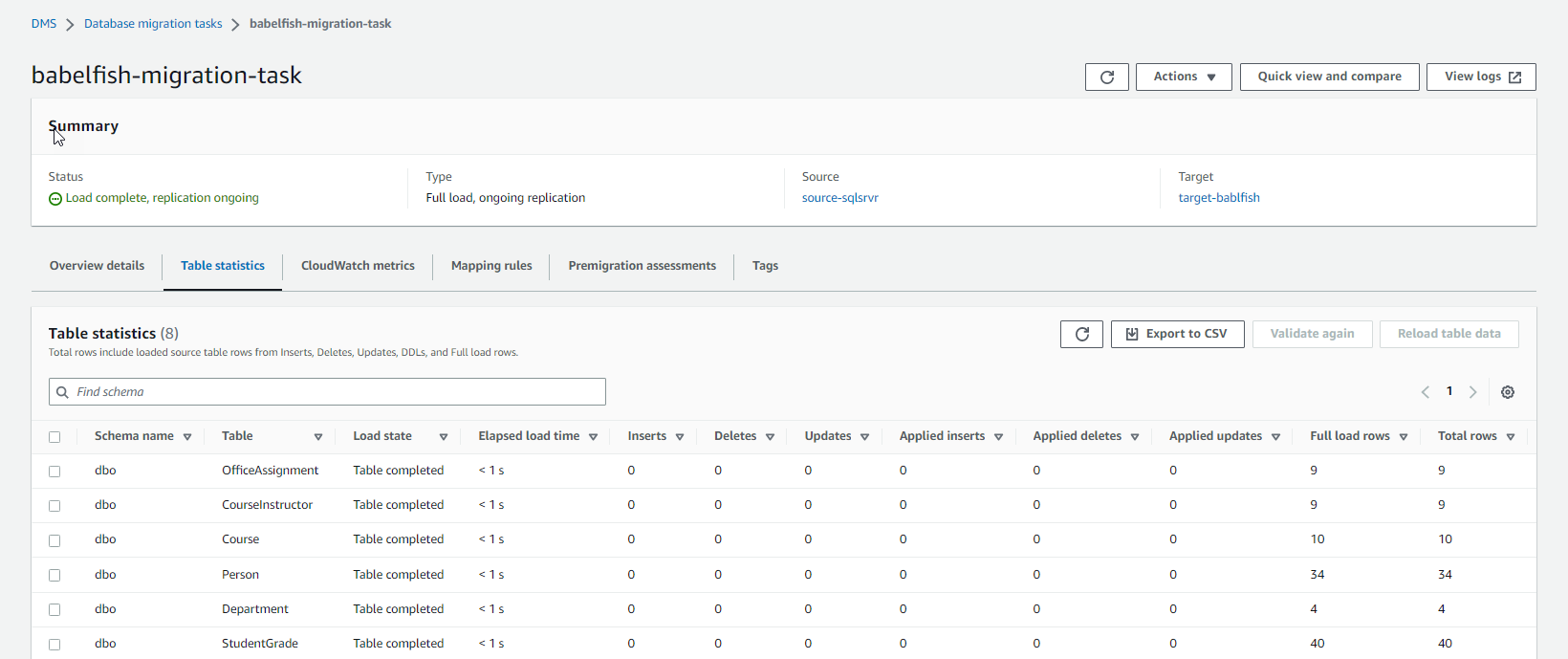 After the AWS DMS task has completed the full load, test the ongoing replication by inserting more rows in the source database. Then monitor the AWS DMS task and validate the data in the target Babelfish database.