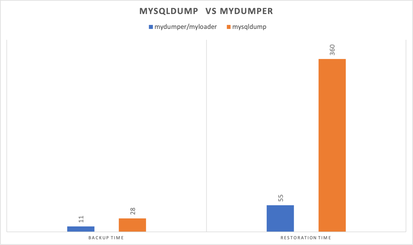 We ran mysqldump and mydumper (four threads) to export a 215 GB database data set on MariaDB instance running on an i3en.xlarge Amazon Elastic Compute Cloud (Amazon EC2) instance (4 vCPUs) to compare the performance with the exports. We restored the files produced by the export processes on an RDS r5.db.4xlarge instance using mysqlnative import and myloader (four threads). The following results show that the mydumper/myloader processes are significantly faster. Backup and restore time is in minutes (smaller is better).