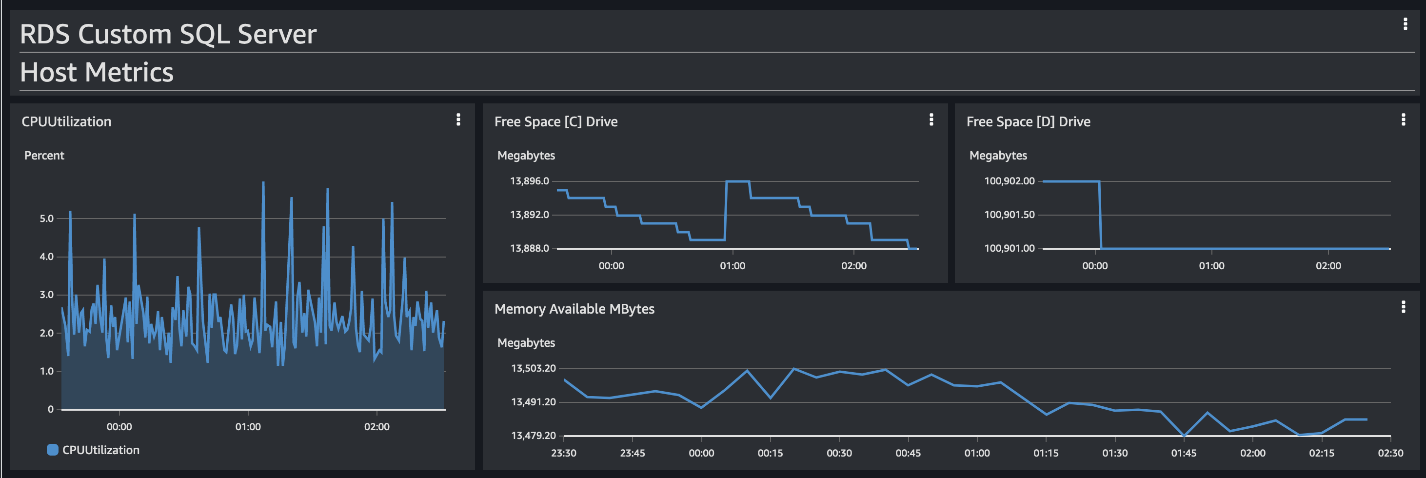 To make it easier to aggregate all the instance levels, volume levels, and SQL metrics in one place, we created a CloudWatch dashboard that enables you to monitor your RDS Custom database from a single pane of glass. The following screenshots show examples of our dashboard.
