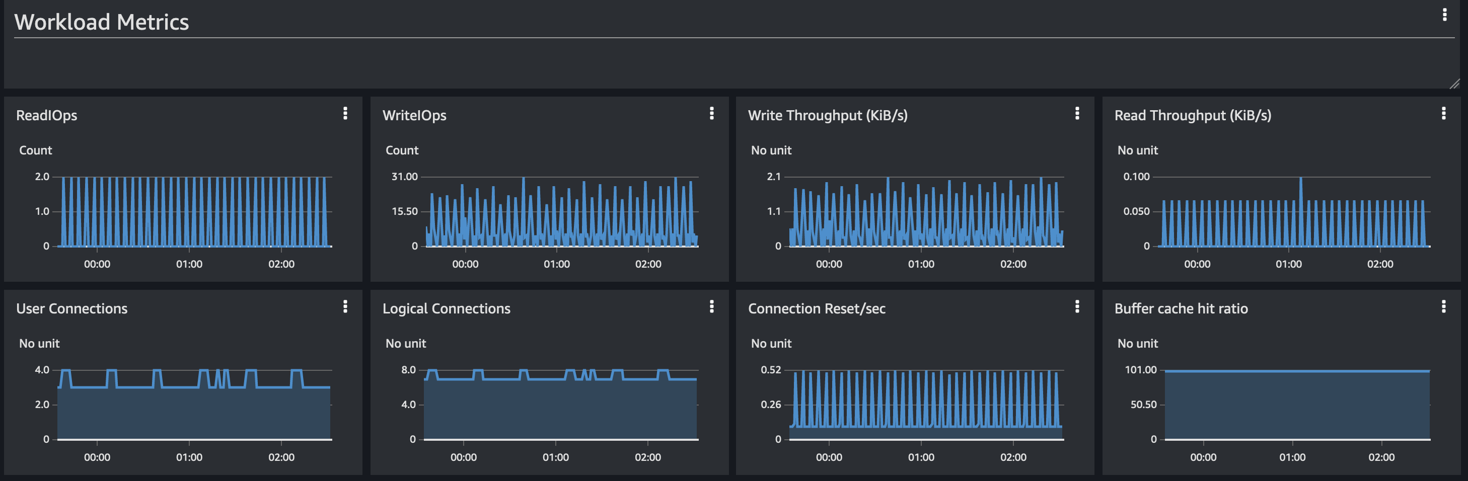 - Workload metrics – ReadIOPS, WriteIOPS, ReadThroughput, WriteThroughput, and database connections