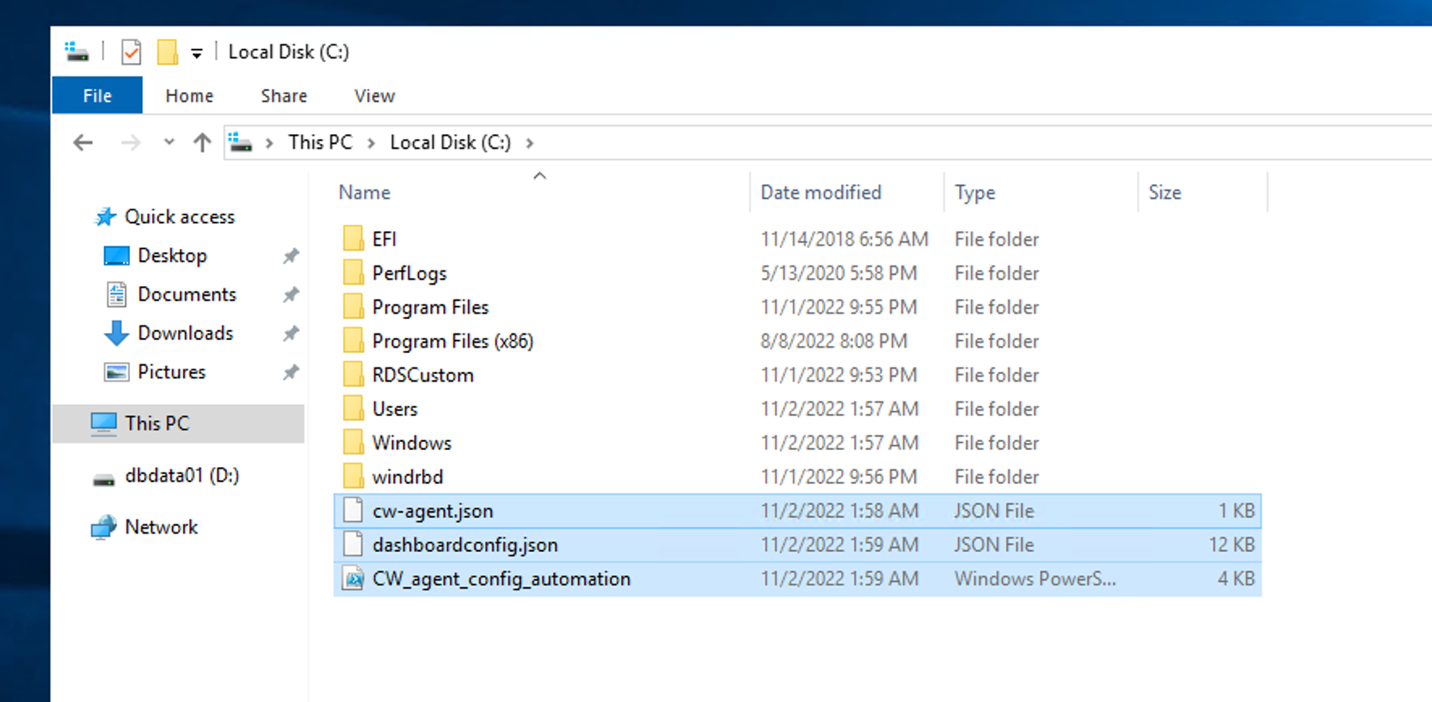 - Copy the CW_agent_config_automation.ps1 file from AWS GitHub repository to the C:\ drive on the RDS Custom EC2 instance.