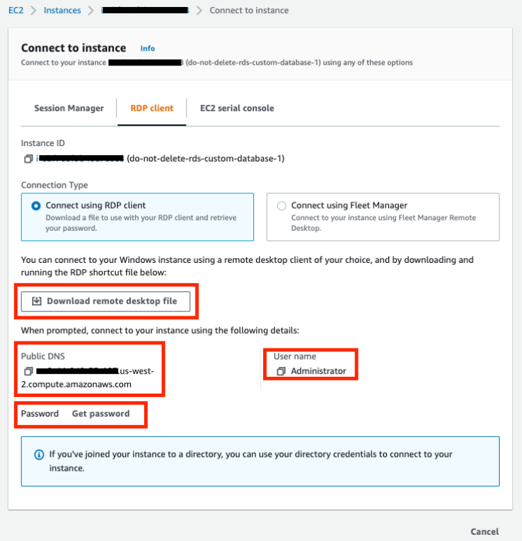 To RDP into your RDS Custom for SQL Server instance, complete the following steps: