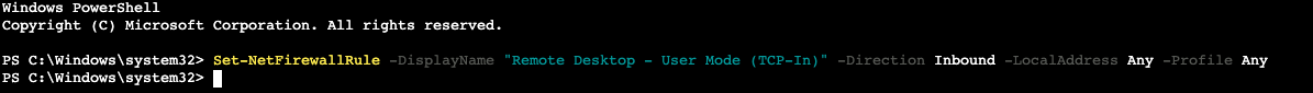 - Enter the following command to configure your firewall to allow RDP connection to your RDS Custom host machine: