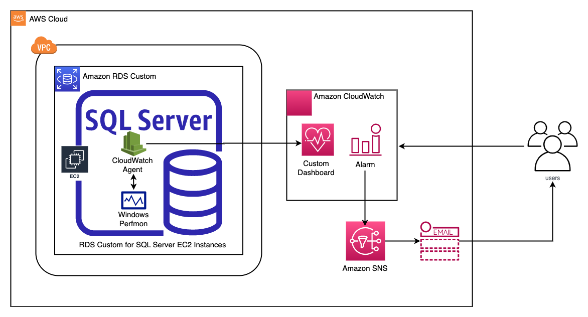 Monitoring is an important part of maintaining the reliability, availability, and performance of Amazon RDS Custom for SQL Server. However, at the time of writing, Amazon RDS Custom for SQL Server doesn’t have managed Amazon CloudWatch monitoring capabilities. In this post, we discuss how to use a CloudWatch dashboard to monitor Amazon RDS Custom for SQL Server, and how to use CloudWatch alarms for proactive monitoring. Additionally, we give a few examples of metrics-related alarms and demonstrate the setup process for improved monitoring capabilities.