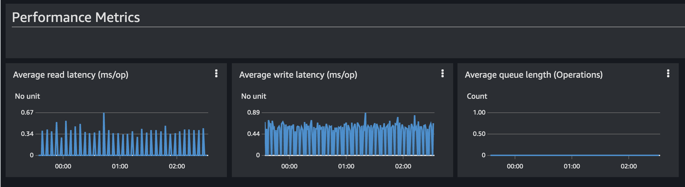 - Performance metrics – Average read latency, average write latency, and average queue length