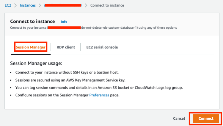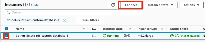 - Select the EC2 instance that was created as part of Amazon RDS Custom for SQL Server and choose Connect.