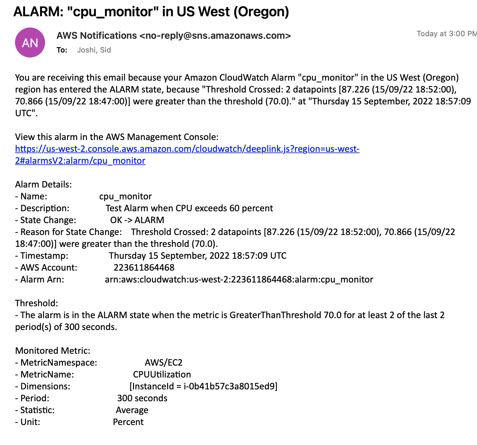 The following is an example of a CloudWatch alarm created on the CPUUtilization metric: