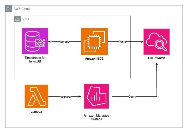 The Timestream for InfluxDB Metrics dashboard is hosted in your AWS account deployed by AWS CloudFormation. The CloudFormation stack is composed of an Amazon Elastic Compute Cloud (Amazon EC2) instance, an AWS Lambda function, and an Amazon Managed Grafana workspace.