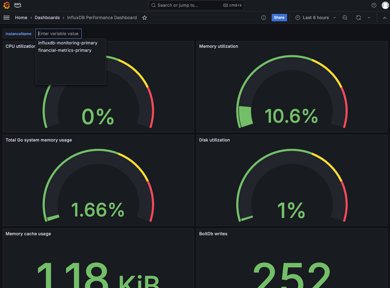 - Choose the dashboard named InfluxDB Performance Dashboard or the alternative name if you altered the context when deploying the dashboard.