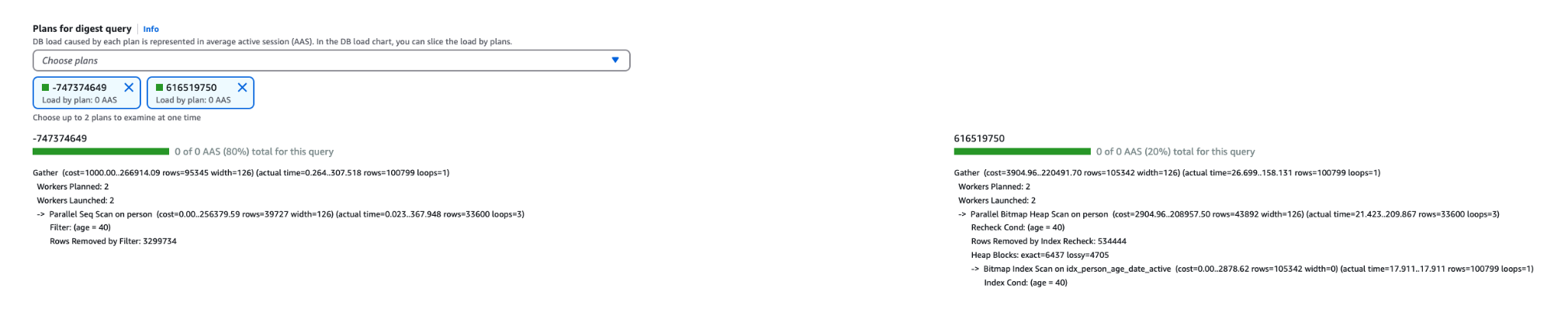 Using the side-by-side execution plan comparison feature in CloudWatch Database Insights to determine the root cause of the performance degradation was simplified by automating what would typically require manual query plan extraction and comparison.