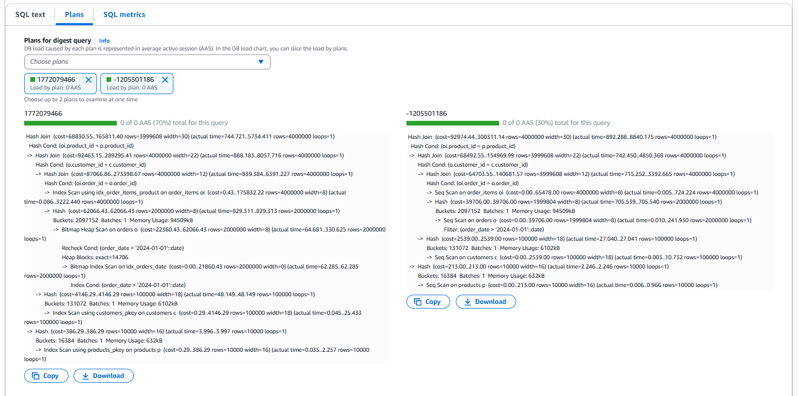 You can use CloudWatch Database Insights to compare execution plans for the same SQL statement over time. This simplifies troubleshooting by highlighting changes that might have led to performance degradation and helping teams quickly diagnose and resolve performance issues.The following screenshot shows the SQL query and its execution plan information from CloudWatch Database Insights. You can also copy or download the execution plans.