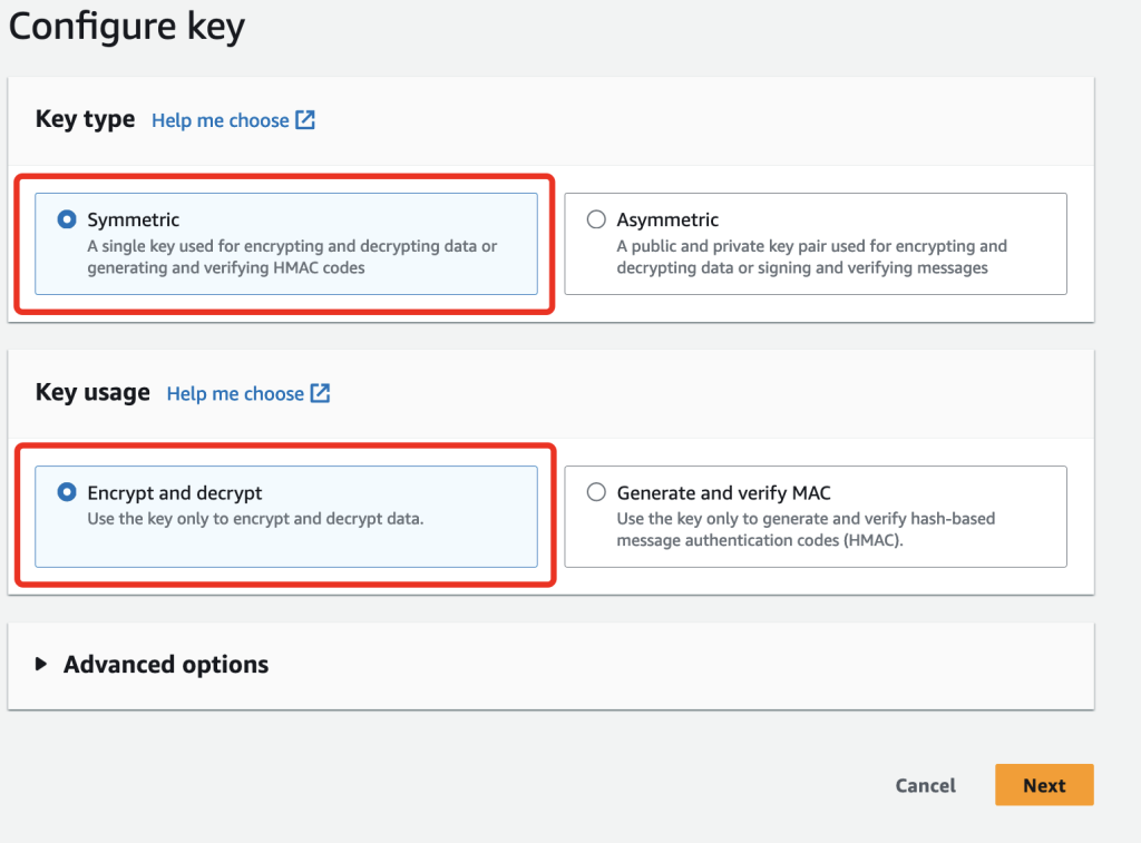 - For Key type, select Symmetric. For more information about symmetric encryption, refer to Symmetric encryption KMS keys.