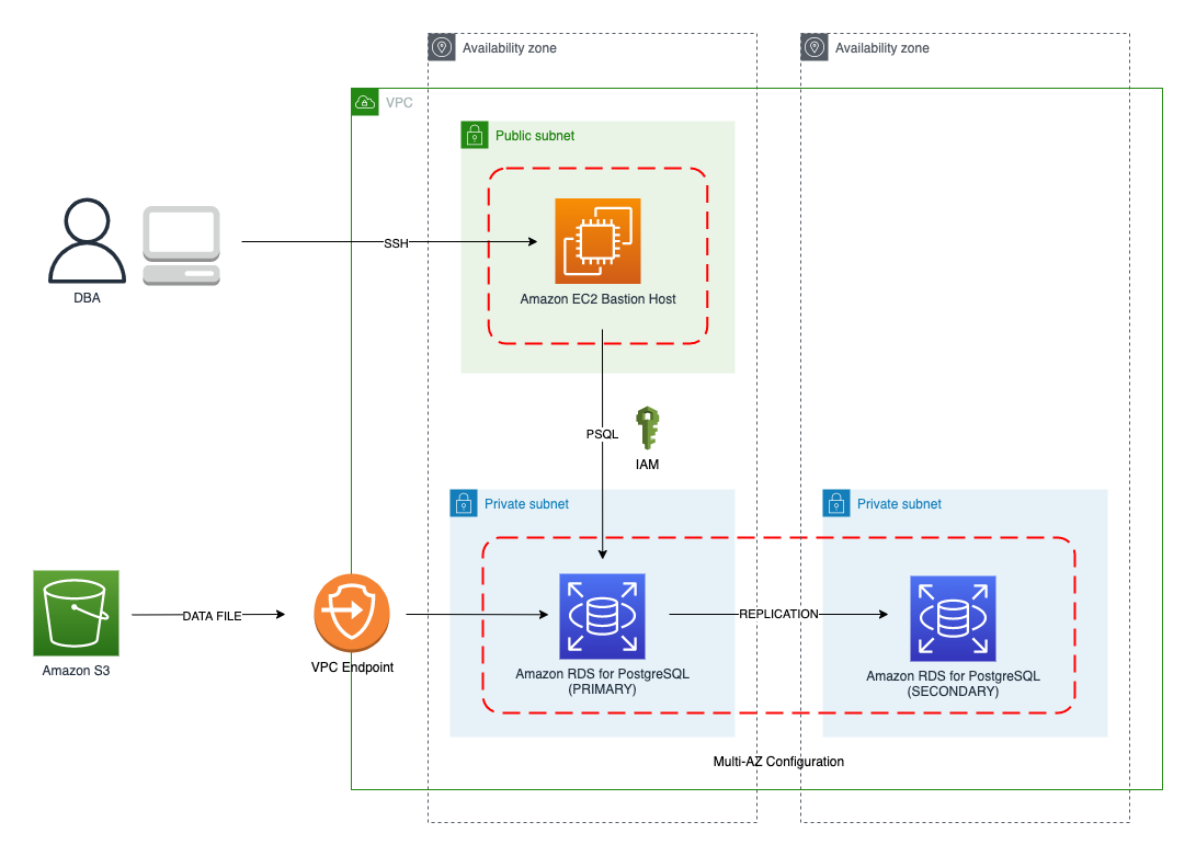 The database instance isn’t publicly accessible because it’s in a private subnet. Instead, the database instance is accessed via the bastion host in the public subnet. We use security group rules to restrict SSH access on the bastion host to our IP address. We use AWS Identity and Access Management (IAM) to authenticate to the database from the bastion host. Finally, we use an S3 VPC endpoint to provide a private route from Amazon S3 to our VPC where our RDS for PostgreSQL database resides.