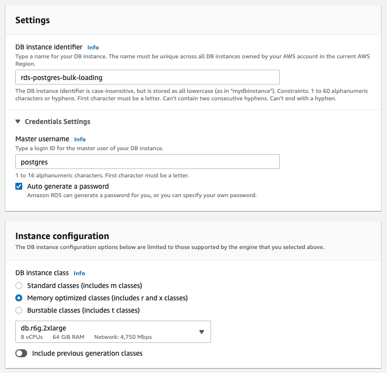 We use the db.r6g.2xlarge instance size with 250 GB of General Purpose SSD (gp2) storage. Later we will change the database storage type to Provisioned IOPS SSD (io1) to compare performance with gp2. Note that dedicated Amazon Elastic Block Store (Amazon EBS) bandwidth and network bandwidth vary by instance size. Refer to the RDS for PostgreSQL pricing page for cost information.