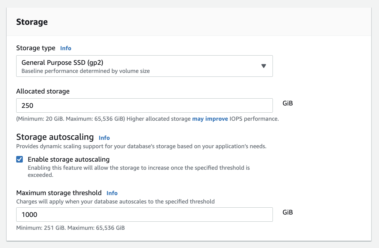 - Allocate 250 GB of General Purpose SSD (gp2) storage.