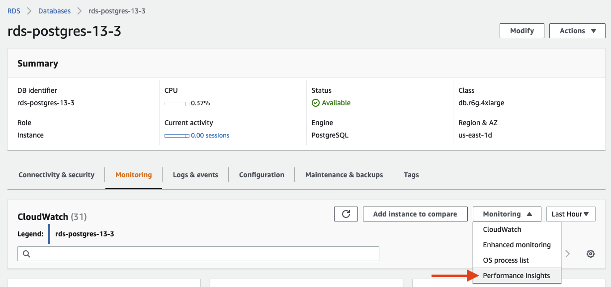 - On the Monitoring tab, expand the Monitoring menu and choose Performance Insights.