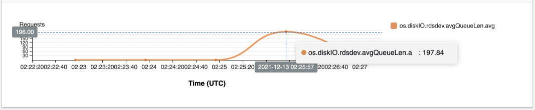To detect whether disk IOPS capacity is a bottleneck, we monitor the disk queue length metric from the performance insights dashboard. When an IOPS request can’t be served immediately by the disk, it’s added to a queue. The length of this queue indicates how much of the I/O load is deferred due to throughput limitations.