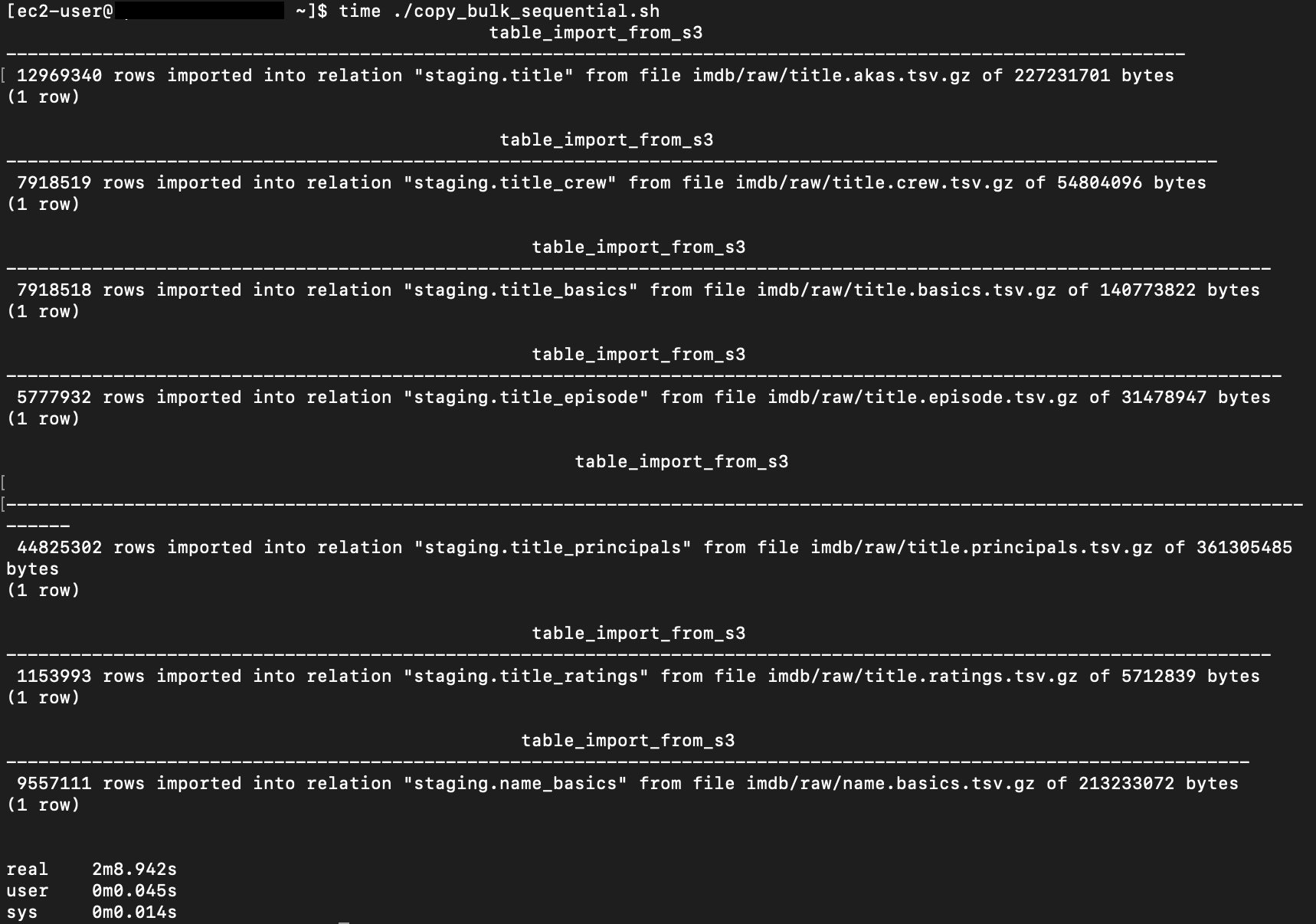 We use the publicly available IMDb datasets for the benchmarking tests presented in this post. We opted not to use the popular benchmarking tool pgbench because its intended primary use is to measure performance of simulated concurrent users executing transactional SQL operations (SELECT, INSERT, UPDATE) rather than bulk loading using the COPY command.