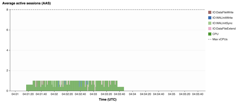 As expected, our db.r6g.2xlarge instance with 8 vCPU shows one active session.
