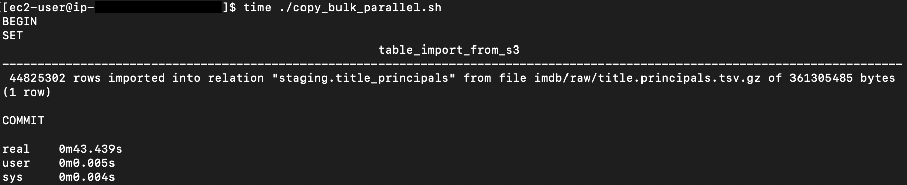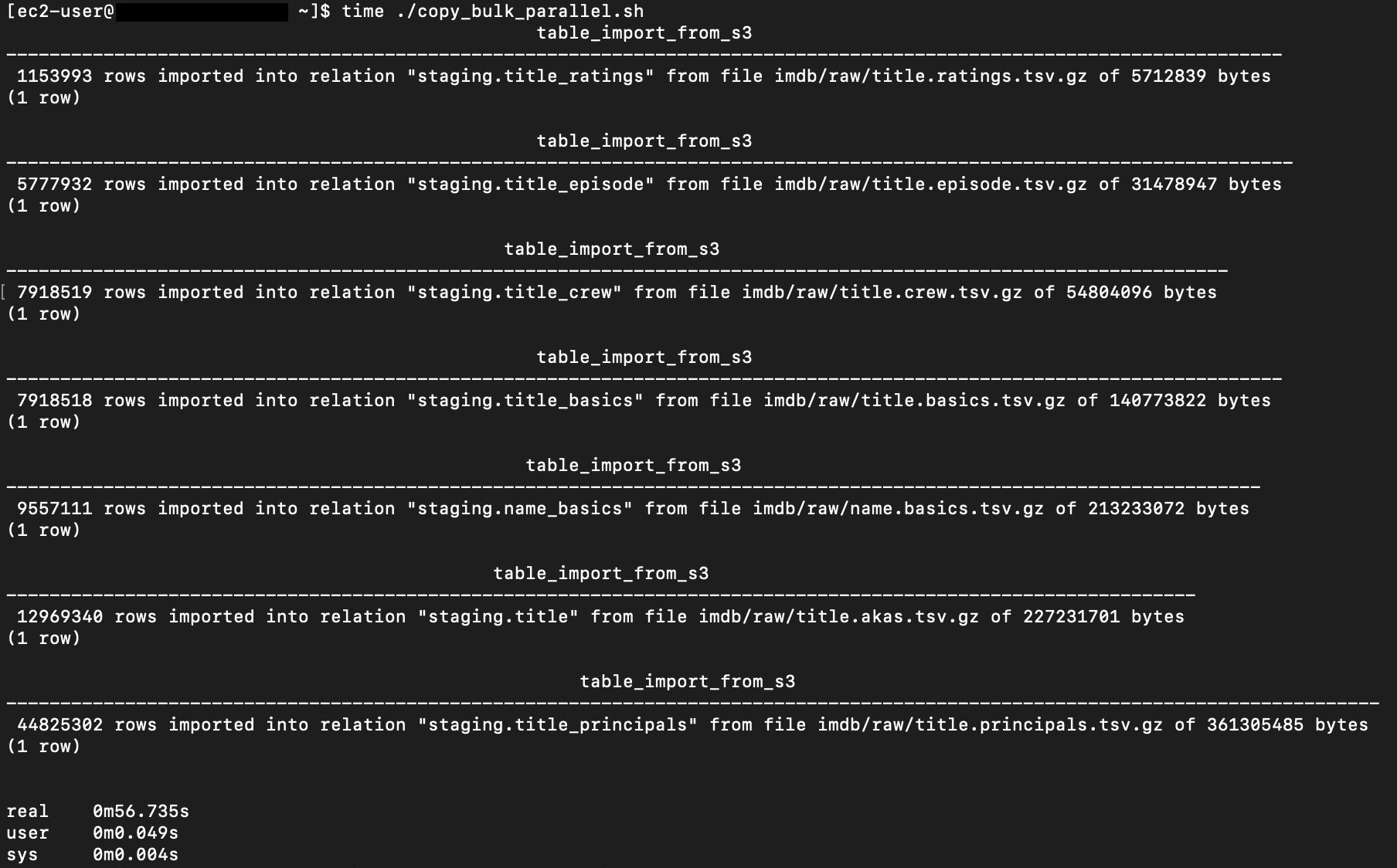 Now let’s see how parallelizing the psql commands alters performance. The following copy_bulk_parallel.sh script runs each psql command in a separate subprocess. Each call creates a separate session in the RDS instance and performs the bulk loading of these seven files in parallel.