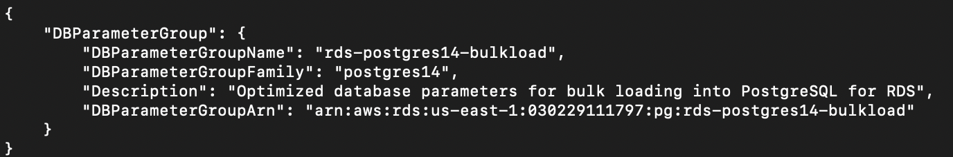 To create a parameter group for bulk loading, we choose the postgres14 parameter group family because it reflects the major PostgreSQL version of our database instance. The creation of database parameter groups and the setting of parameter values can be done programmatically via the AWS Command Line Interface (AWS CLI), SDK, or API. We use the AWS CLI for these examples, which are available in the GitHub repo.