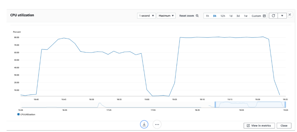 The following CloudWatch metric shows the CPU utilization for the AWS DMS instance.