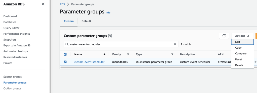 This is a dynamic parameter and you don’t have to reboot your instance. Now you should be able to configure the event scheduler on your database instance.