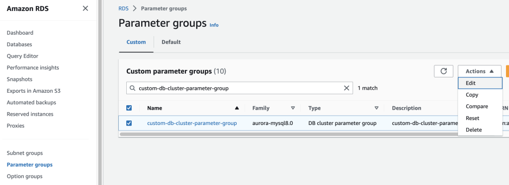 2. Select your parameter group and on the Actions menu, choose Edit.