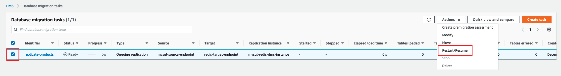 replicate-productstask. - On the Actions menu, choose Restart/Resume.