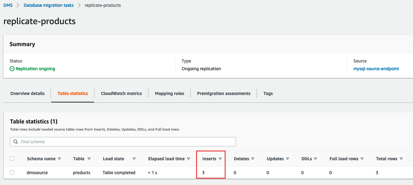 To verify data replication via the AWS DMS console, navigate to your database migration task and choose the Table statistics tab. Check that the inserted records show under the Inserts column, and that it matches the number of records you inserted in the previous step.