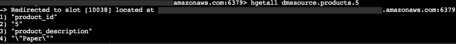 Finally, we connect to ElastiCache for Redis to verify data replication. In your Sessions Manager terminal window, establish connection to the ElastiCache for Redis cluster and retrieve the values for one of the keys as shown in the following code: