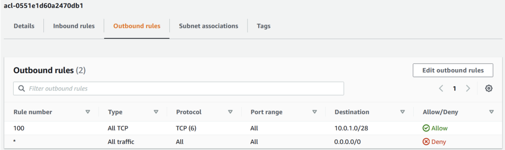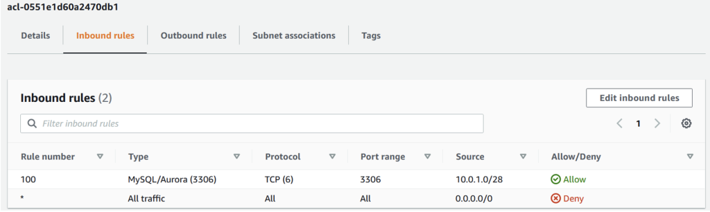 For example, below ACL configuration provide access to instances in my public subnet group with VPC CIDR (10.0.1.0/28) to communicate to database on port 3306 in the inbound rules. The network ACL outbound rules configured to allow traffic on the ephemeral port ranges that are used by MySQL clients to communicate to the database.