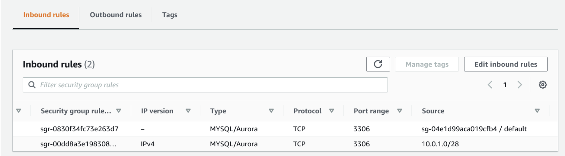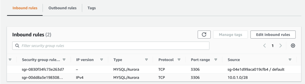 Below is sample security group attached to one of the RDS instances that allows access from VPC subnet group with CIDR 10.0.1.0/28 and from default security group association. Providing access to another security group allows traffic based on the private IP addresses of the resources associated with the specified security group.