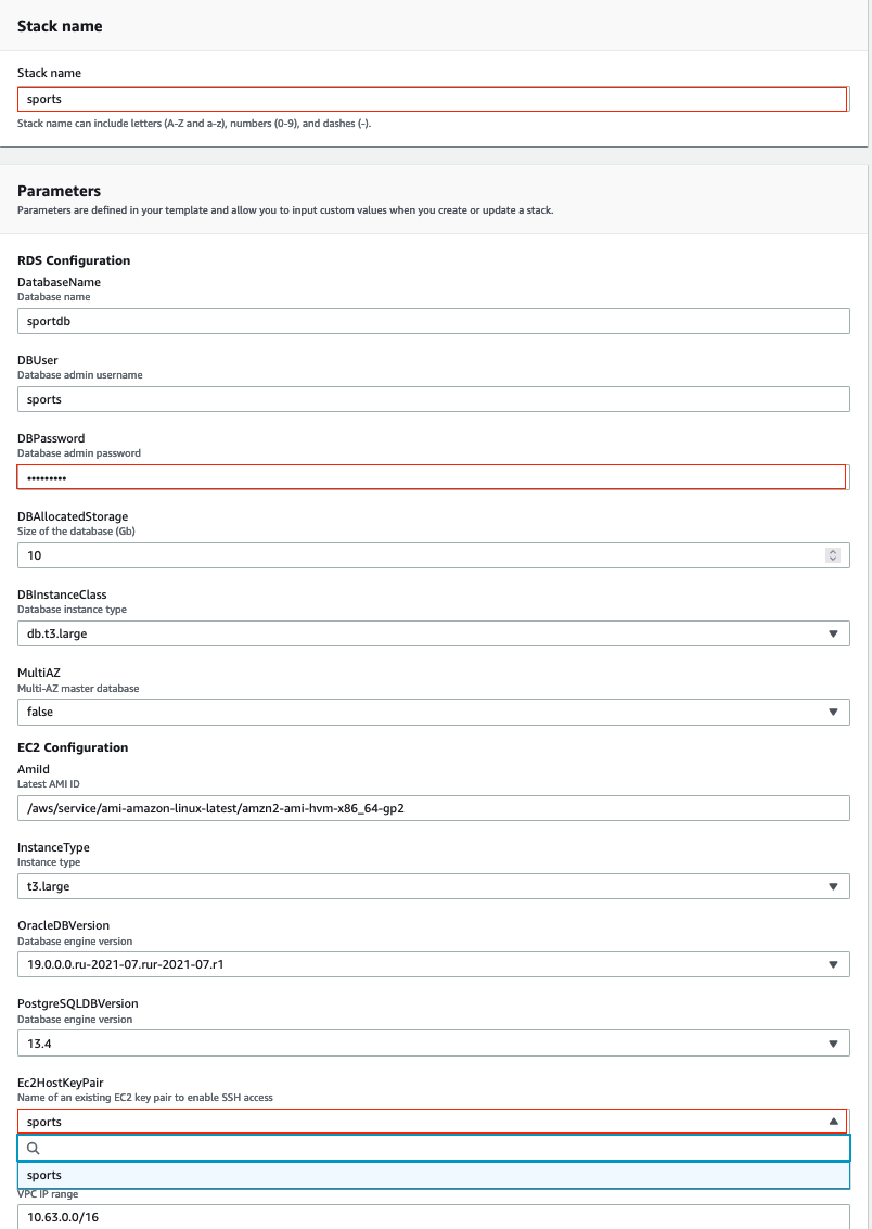 - For Ec2HostKeyPair, enter an existing key pair.