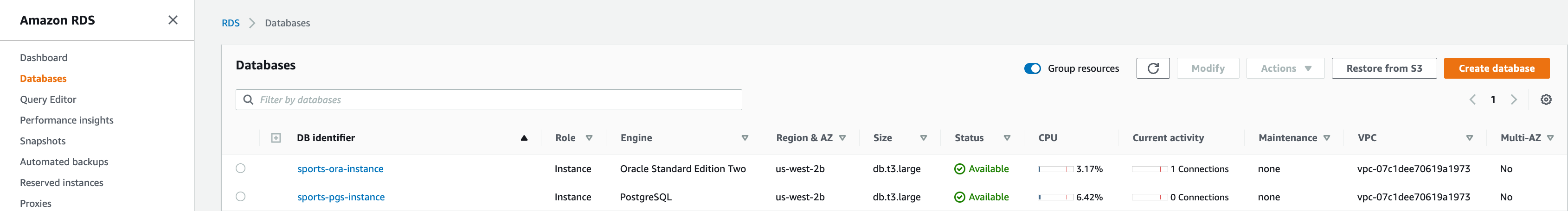 On the Databases page of the Amazon RDS console, you can confirm that both the RDS for Oracle instance and RDS for PostgreSQL instance are created and available.