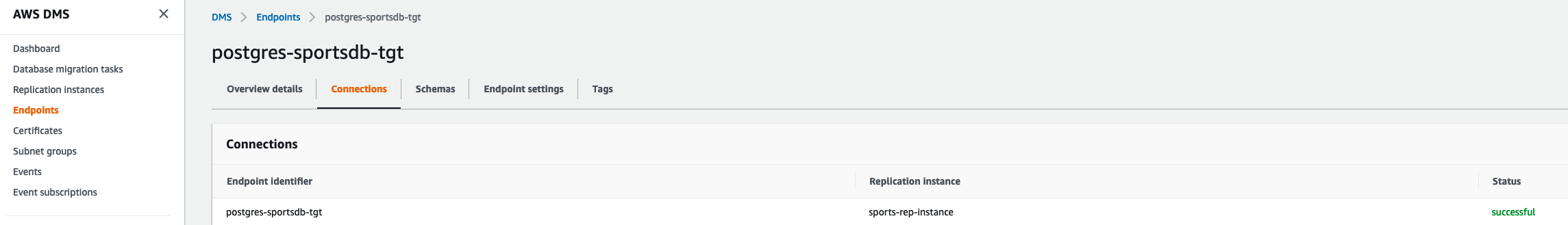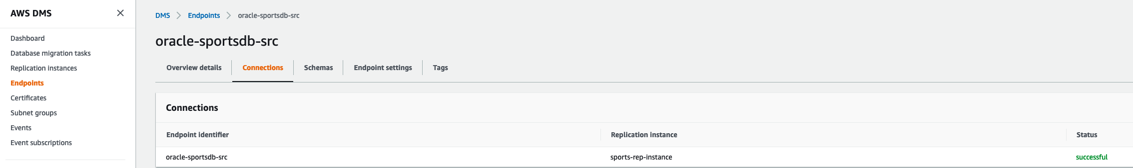 On the AWS DMS console, you can check that both AWS DMS endpoints are created and shows a successful status.