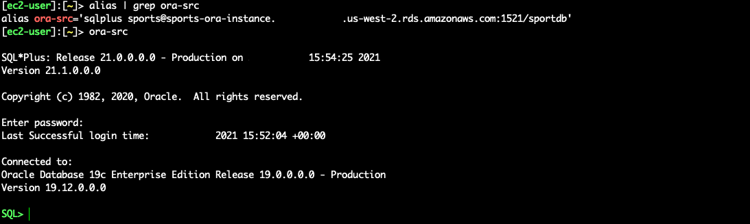 - Connect to the Oracle source database using the alias