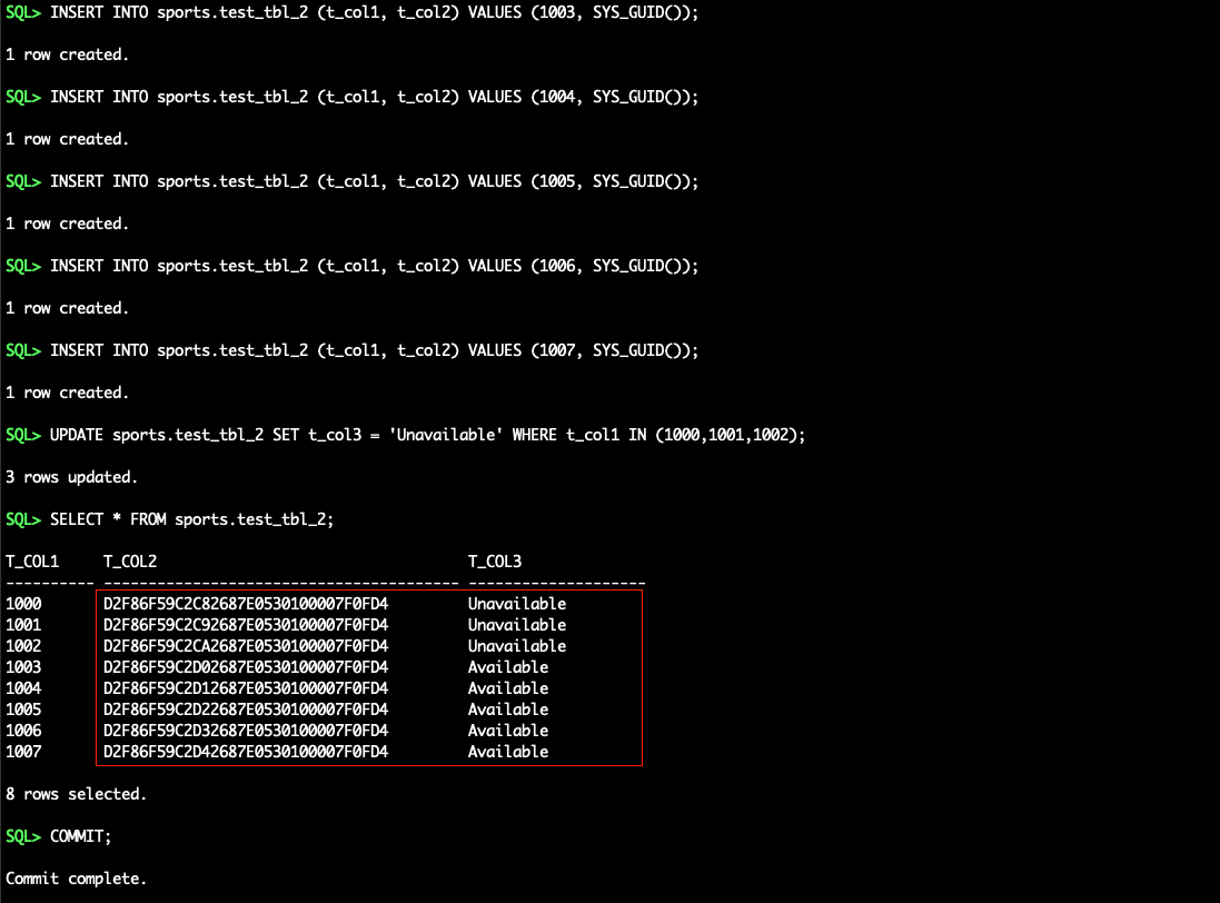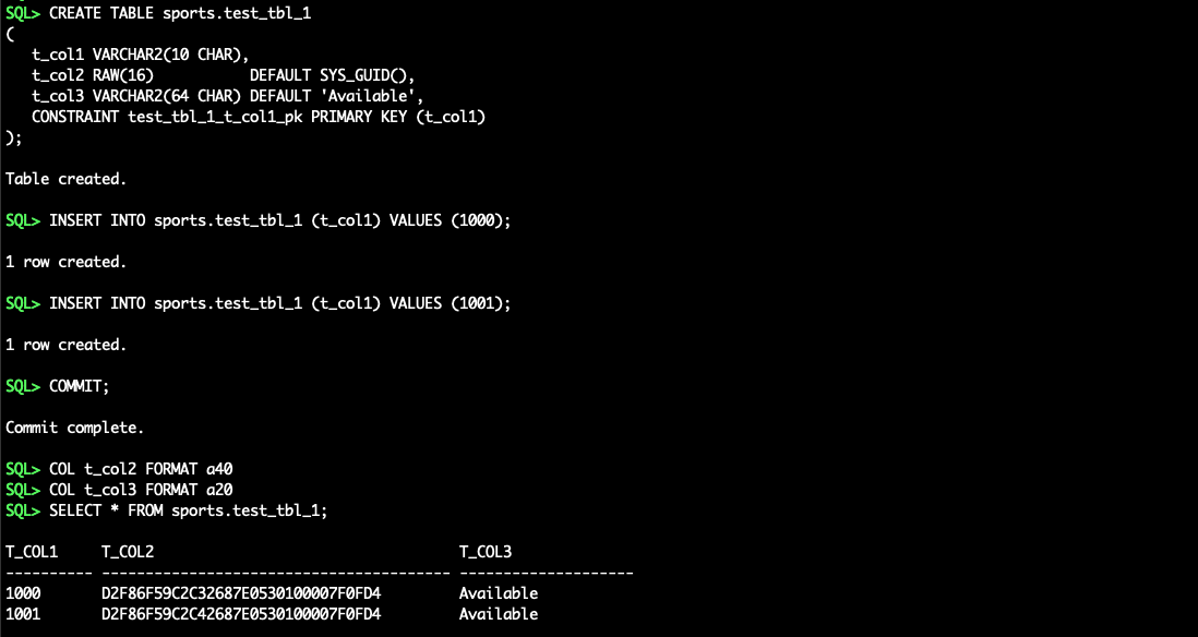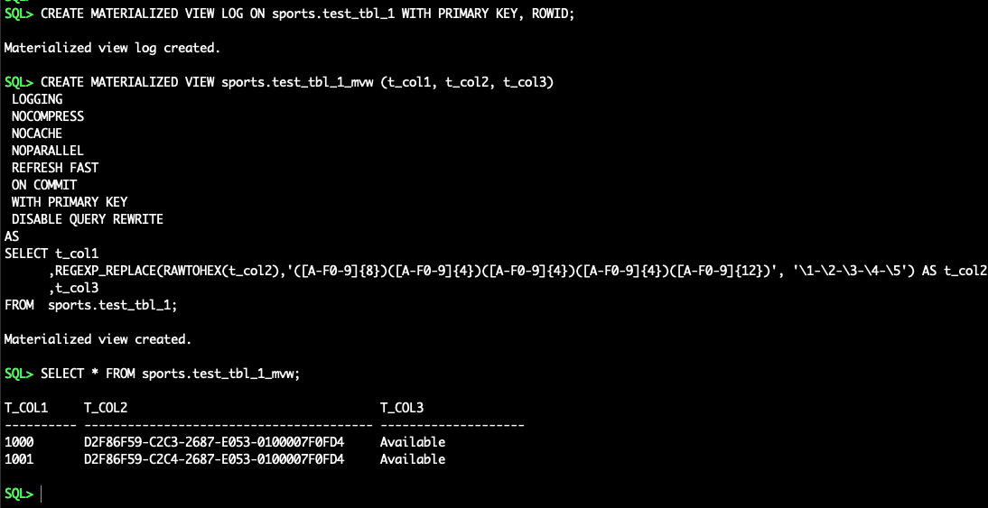 SPORTS.TEST_TBL_1(required for fast refresh), create the materialized viewSPORTS.TEST_TBL_1_MVW(converting GUID data into UUID format), and enable supplemental logging on the materialized view: