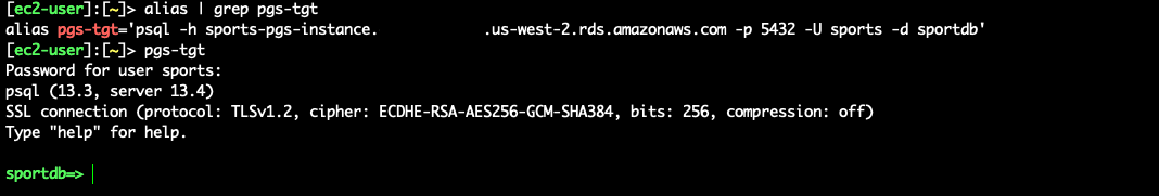 - Connect to the target RDS for PostgreSQL instance using the alias