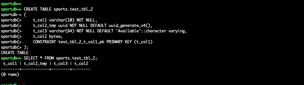 Next, we create the table on the target PostgreSQL with UUID data type. As of this writing, AWS DMS doesn’t support the update-column action, so for this post we use a two-step approach. First, we use the add-column action to add a new column T_COL2_TMP. We then use T_COL2_TMP in the table mapping rules to store the UUID formatted value. When migration is complete, we then drop the original T_COL2 and rename T_COL2_TMP to T_COL2.