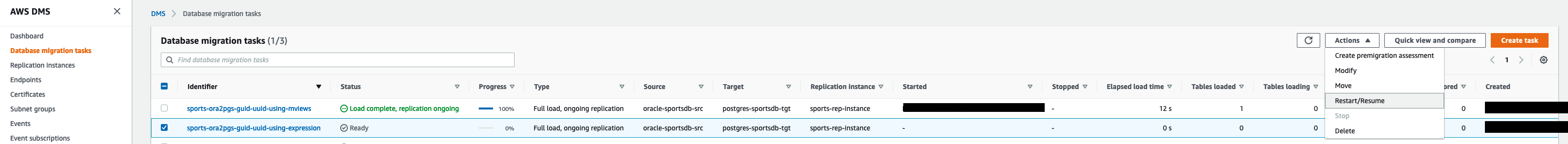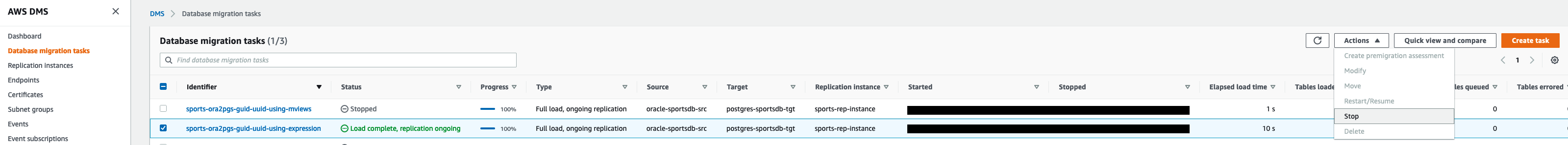 Next, we start the DMS task sports-ora2pgs-guid-uuid-using-mviews with mapping rules to load from the Oracle materialized view (TEST_TBL_1_MVW) to the PostgreSQL target table (TEST_TABL_1). The task is created with full load and ongoing replication, and TRUNCATE_BEFORE_LOAD for table preparation because we already created the target table.